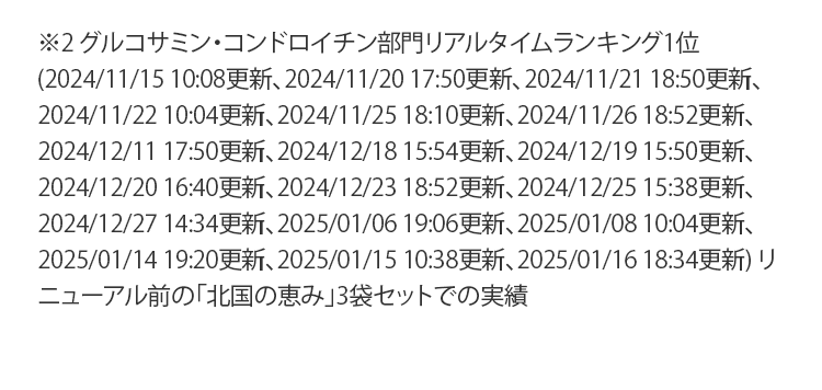※1 機能性表示食品とは、事業者の責任において科学的根拠に基づいた機能性を表示した食品です。販売前に安全性及び機能性の根拠に関する情報などが消費者庁長官へ届け出られたものです。ただし、特定保健用食品とは異なり、消費者庁長官の個別の許可を受けたものではありません。※3 『北国の恵み』の定期購入で3ヶ月目のお客様から無作為に抽出したお客様を対象にアンケート調査を実施。(2013年5~6月)n=100『北国の恵み』を「満足」「やや満足」と回答した方91名、「普通」「やや不満」「不満」と回答した方9名。リニューアル前の「北国の恵み」の実績
